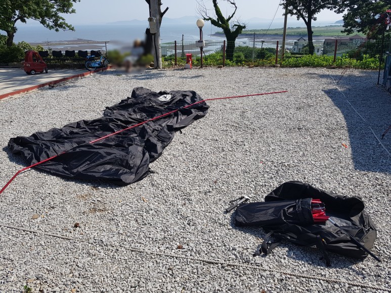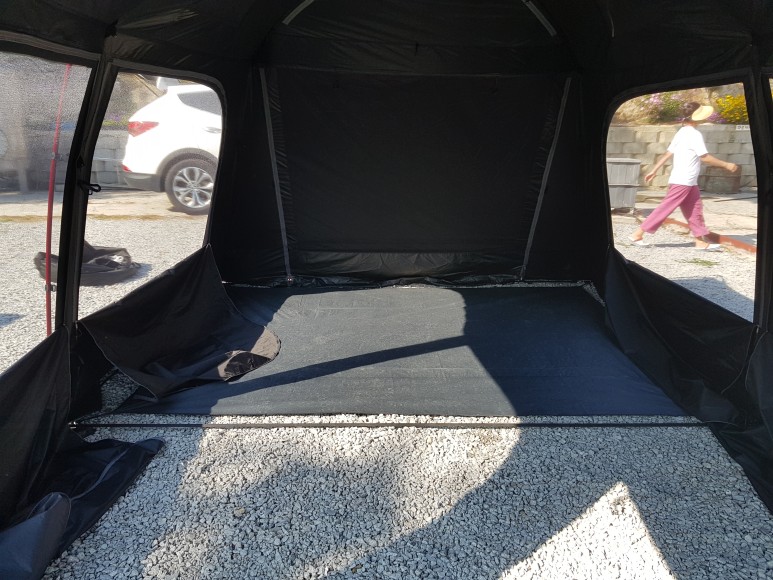 더우니깐 일단 옆에 다 열어주고 이너텐트가 설치될 곳에 방수포를 깔아줍니다.